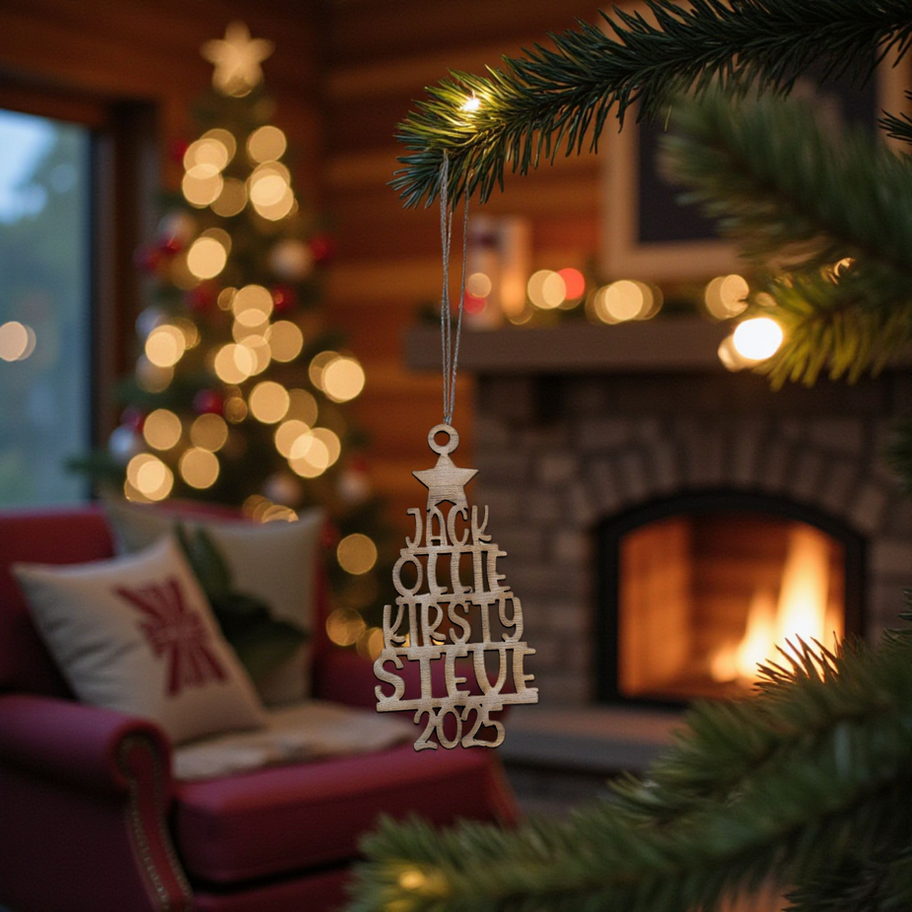 Custom-Cut Design: Featuring up to six names stacked in the charming shape of a Christmas tree, topped with a delicate star.
